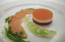 4月の上旬に高知から有機トマトの第一便が届き、それから約一ヶ月、 試作を続けて、やっと上の写真の有機トマトを使った前菜が出来上がりました。 今回は、1番下に有機トマトの濃縮ピューレ、その上に生クリームそしてその上に トマトのジュースをジュレにした物を重ね、こちらを口の中で混ぜながら 召し上がって頂くと言う前菜にしてみました。 ちなみに昨年までは、クリームとピューレを混ぜて、そこへゼラチンを少々加えて 固め、ガトー仕立てにして出していたのですが、 今年はシェフの考えで、お客様に、もっともっと食を楽しんで頂こうと言う事で この様な3食形にし、お客様自身の口の中で、食材が混ざり合い トマトがフワッと、そしてスーと溶けていく味の変化を、 お楽しみ頂けたら幸いだそうです・・・<シェフからの一言> それから、このトマトの横に添えてございます、北海道産の海マスは 5月いっぱいまでしか獲れないそうなので、大変申し訳ございませんが、 6月からは他の鮮魚に変更となります。 そして、もう一つ、付け合せになっている青いトマトの自家製ピクルス、 こちらは同じ高知産のトマトでも青いトマトなので、非常に酸味があるんですが、 ムースと一緒に召し上がって頂くと、かえって、この酸味が 爽やかな アクセントになって、全体的にしつこくなりがちな、クリームを使った お料理も非常に初夏らしい爽やかな1品に変身?いたします。 と言う事で、この辺で私達が試食した感想を一言、 トマト万歳と言う感じでした。オホホホ すみません30過ぎてこんな事 を言ってて・・・・反省反省。 それでは今週はこの辺で、 追伸・本日、いつものように自転車で六本木ヒルズのエレベーター待ちを していたら、当店がお世話になっている酒屋さんの営業の方に ぽんぽんと後ろから肩を叩かれ、にごり梅酒の見本を1本貰ってしまった。 <オレンジ色をしていて、まるでオレンジシュースのような感じでした> 本来ならば、その場でお礼を言わなければいけなかったのですが、 ご本人は携帯電話でお客様と、何だかお話中のようだったので、 これは 邪魔をしてはいけないと、しっかり者?の私は にごり梅酒だけをしっかり 握り締め、バイバイと手を振り 自転車でその場を走り去ってしまった。 今から考えると、これってちょっぴり失礼?薄情?だったかしらと反省。 島田屋ジェノスさんごめんなさい。このにごり梅酒に関してはしっかり試飲して、 今度感想文を提出しますね。