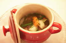 最近、とっても綺麗なお月様を眺めながら夜道を自転車で帰るのが 楽しみな私達、皆様もお月様ご覧になられましたか? 先週は本当に素晴らしかったですよー。 もし、見損なったーと言う方は、当店のリンクコーナーをクリックし、 ブログ版と言う所をクリックされると、とっても綺麗なお月様が見られますよ。 それから、今回は9月から登場致しました、もち米入りオックステールのポトフ のご紹介。こちらは、先月まで登場していたブレス産ホロホロ鳥のココット焼き からヒントを得て、シェフが、前々から使ってみたかった、もち米を使用して 出来た新作で、私の様にお米好きの方には是非お薦めしたい1品です。 オックステールのした処理や煮込み方については、 前に、この日記のコーナーにて詳しくで紹介しておりますので この場では省きまして、今回は、その煮込んだオックステールを細かくほぐし、 その中に蒸したもち米と細かく切った蓮根を入れ、 網脂で包み込み、よーくソテーし脂を綺麗に焼き切ってから オックステールを煮込んだ時のスープとコンソメと季節の野菜と共に 合わせてみました。試食した感想と致しましては 蓮根のシャキシャキ感と、もち米のモチモチ感と、オックステールの 少々ゼラチン質な脂と深みのあるスープが、とっても熱々でしたが、 そんな事も忘れてしまうほど、あっという間に食べられちゃいました。 皆様も絶対1度はお試し頂きたい秋冬の1品です。 そうそう、私、この当店のオックステールのポトフ、 個人的には≪食べての立場としての素直な感想としては≫ とっても大好きなんですが、経営者の立場から考えると大嫌いーと言いたい ぐらい、原価が掛かり、本当ならばアラカルトで1品¥6000位 頂かないとあわなよなー。トホホ と渋い事を考えつつも シェフの自分が納得が出来ない物は出せない。 と言う強い意志≪信念≫には 勝てず、毎日調理場の隅で、小さな声でブツブツと 念仏でも唱えるが如く 『ねえねえ、どーしてそんなに原価が掛かるの?』と尋ねている私に またまたシェフの一撃、『納得がいく味を出すにはお金が掛かるのは当たり前 洋服でも靴でも同じでしょ』と言われ、ここで引き下がってはと、 では、納得がいく味と、いかない味について検証させてくれーと 今回はシェフの説明を聞きながら、まずオーソドックスに和牛オックステールのみ でフォン≪出汁≫を取ってどの位の味に仕上がるのか 試食させて貰ったのですが、これはあくまでも私の個人的な感想ですが、 味が薄くて、何の味だかよく解らないと言うのが正直な感想でした、 その後に、今度は鳥のブイヨンで煮込んだオックステールのスープを試食し、 それも、先程の物よりは、少しコクが出た印象はあっても、何かピンと来ず、 その後に、シェフがいつもやるやり方、 予め取った鳥のブイヨンの中でオックステールを煮込み、 その後、その煮込んだスープを煮詰めた物に、更に牛のコンソメを 加えて、味を調えた物を試食したんですが、これは流石に、一口、 口に含んだだけで、歴然と先程の物とはスープの濃さ・味の深みが違う ことが解りました。そう丁度 写真で例えるならば、 パッとピントがあった様な感じで、 あーこれがシェフが考える納得がいくと言う味の出し方なんだ、 と実感させられた貴重な体験でした。 しかし、これは、あくまでも当店のやり方であり、人それぞれ 味の感覚も作り方も違いますので、その辺は予めご了承下さい。 と今回はこの辺で、また、 追伸・先日お世話になっている輸入元フィネスさんのワイン会で 久しぶりに、マルキダンジェルヴィルの2003年ヴォルネイ シャンパンと ヴォルネイクロデデュクを試飲してビックリ、2003年は今飲んでも楽しめるぐらい 果実味が出ていました。通常なら長熟タイプのワインなので、 もっと酸や渋みを感じると思っていただけに、とっても以外でした。 そう言えば、ロワールのディディエダグノーのプイィフュメも、2003年は酸が少なく、 どちらかと言うと、熟成させるよりも、今飲んで楽しめる印象でした。 とにもかくにも、ワインやシャンパンの価格は上がる一方で下がる事は無い 状態なので、レストランにとっては、とってもトホホな状態なんでございますよ。