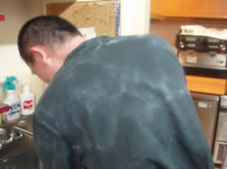 2003年から、コツコツと更新してまいりました このホームページも、チョコチョコと覗いてくださるお客様方のお陰で、 昨日、無事アクセス数10万を突破する事ができました。 本当に有難うございます。これからも、少しづつではございますが、 なるべく、自分らしくお客様にリアルタイムで、お店の情報をお知らせできるようにと 思っておりますので、どうぞよろしくお願い致します。 それから先週土曜日に、今年初の岩牡蠣 <夏が旬のクリーミーな味わいの大きな牡蠣です> が入荷致しましたが、たまたまご来店下さったお客様方が 牡蠣好き?だった事もあり、 あっと言う間に完売してしまいました。 がしかし、只今大急ぎで新しい物を注文している最中でございますので ご希望のお客様は楽しみにしていてくださいね。 それから、この岩牡蠣については毎年ながら、非常に天候に左右されますので、 もし、運良く入荷している時に、ご来店頂いたお客様は、是非お見逃しなく。 トライしてみて下さい。酸味の利いたサッパリとしたレモンのジュレと よりクリーミーさを引き出すために、サッと火を入れた超レアー状態の岩牡蠣は きっと皆様の記憶に残る1品となる事でしょう。オホ それでは、今週は、もう一度、新登場のメニュー写真と紹介文を アップする予定ですので、お楽しみに。この辺で一旦失礼いたします。 追伸・最近、気温が ググッと上がってきた為、シェフのいる調理場は サービス中、40度以上になる事も多々あり・・ティーシャツが塩だらけになってしまうのです そんな恐るべし姿をちょっぴりアップしてみました。 それから、先週アメリカから一時帰国されていた永田さん無事アメリカに到着しましたか? また、シンガポールやニューヨークからお仕事で一時帰国されているお忙しい中を わざわざ、お顔を見せに入らして下さったお客様、本当に有難うございました。 それから、仙台の鈴木さん土曜日は突然でビックリしましたが、遠い所を お立ち寄りくださり有難うございました。 また、シェフと言う本を見て、大阪から入らして下さったお客様も有難うございました。 シェフも、皆様と久しぶりに、お会い出来て非常に喜んでおりました。