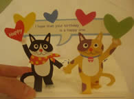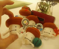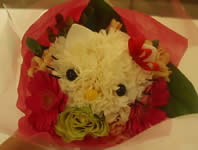 まず左上は、先週仲良しのお客様に頂いたハローキティーのブーケ、これがお花で出来ているだなんて、恐るべしですよね、それからお隣のバースデーカードは今一番のお気に入りでして、飛び出す猫2匹がとっても可愛いでしょ?特に水玉のスカーフを横結びにする所がなんとも言えずグーですよね、そう思うのは私だけかしら?オホ。それから下の段左は、先週京都から入らして下さったヒロさんがお土産に下さった豆乳で出来ている可愛らしい兎の形をした、らんがくと言うお菓子です。口の中でスーと溶けて、とっても上品なお味でした、それからお隣はこれまたお気に入りのフライパンを持ったドコモ茸さんです。