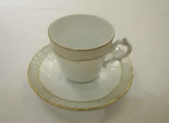 こちらは、最近入荷したばかりのリモージュ焼きベルナルドで、シリーズの中でも古典的な柄をモダンに表現している所がお気に入りのカップです。ルーブルなんてネーミングも美術館好きにはたまりませんよね、そしてこのカップの特徴は渦巻きのような模様と下皿の真ん中が浮き上がり、そこが柄になっているところです、白いカップでもとてもモダンなんですよ。 |