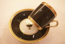 こちらも最近新しく入荷した、リモージュ焼きベルナルドのセレストと言うシリーズ、何でもセレストとは天空を意味するらしく、このシックな水玉さん達がフワフワと浮かんでいる様子は☆をイメージしているようですよ、何ともロマッチックなカップさんですよね、こちらのカップは最近の私の一番お気に入りさんです。オホホホ |
