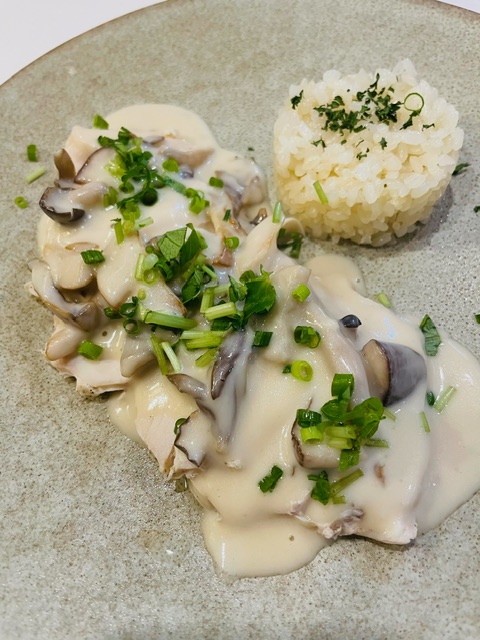 若鶏胸肉のブレゼ、キノコ入りクリームソース