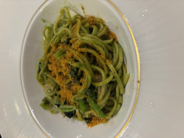 自家製手打ち麺日本ほうれん草のソース、カラスミ添え