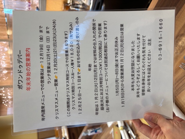 この期間は、コース料理の為ラストオーダーの時間が早まります