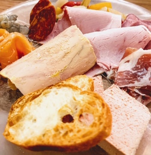 (三元豚のリエットや鶏白レバーのムース。牛タンの塩漬けや