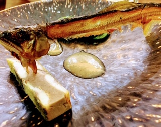 ムースガトー仕立て、鮎のテリーヌ山椒のソース、